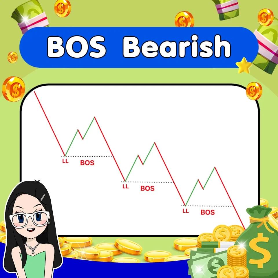 | BOS (Break of Structure) | การที่เทรนด์ Break ไปในทิศทางเดิม เพื่อทำ New High ใหม่ไปเรื่อย ๆ ตามแนวโน้มของตลาดเดิม |
